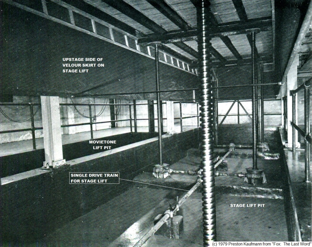 The trap room with the Peter Clark worm-gear stage lift mechanisms, from the vantage of downstage right, Movietone lift pit dead ahead.