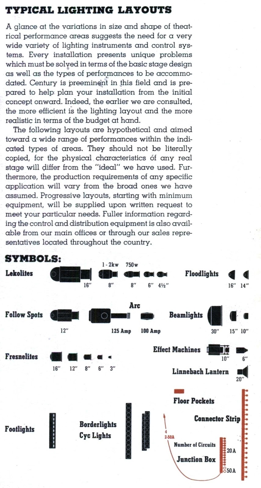 This 1960 Century book is more of a textbook than catalog, and the first ever written for college lighting designers who were a new breed. It's comprehensive in scope, exacting in detail, and as the book reveals, Century had most of the shows on Broadway, so it's also authoritative.
